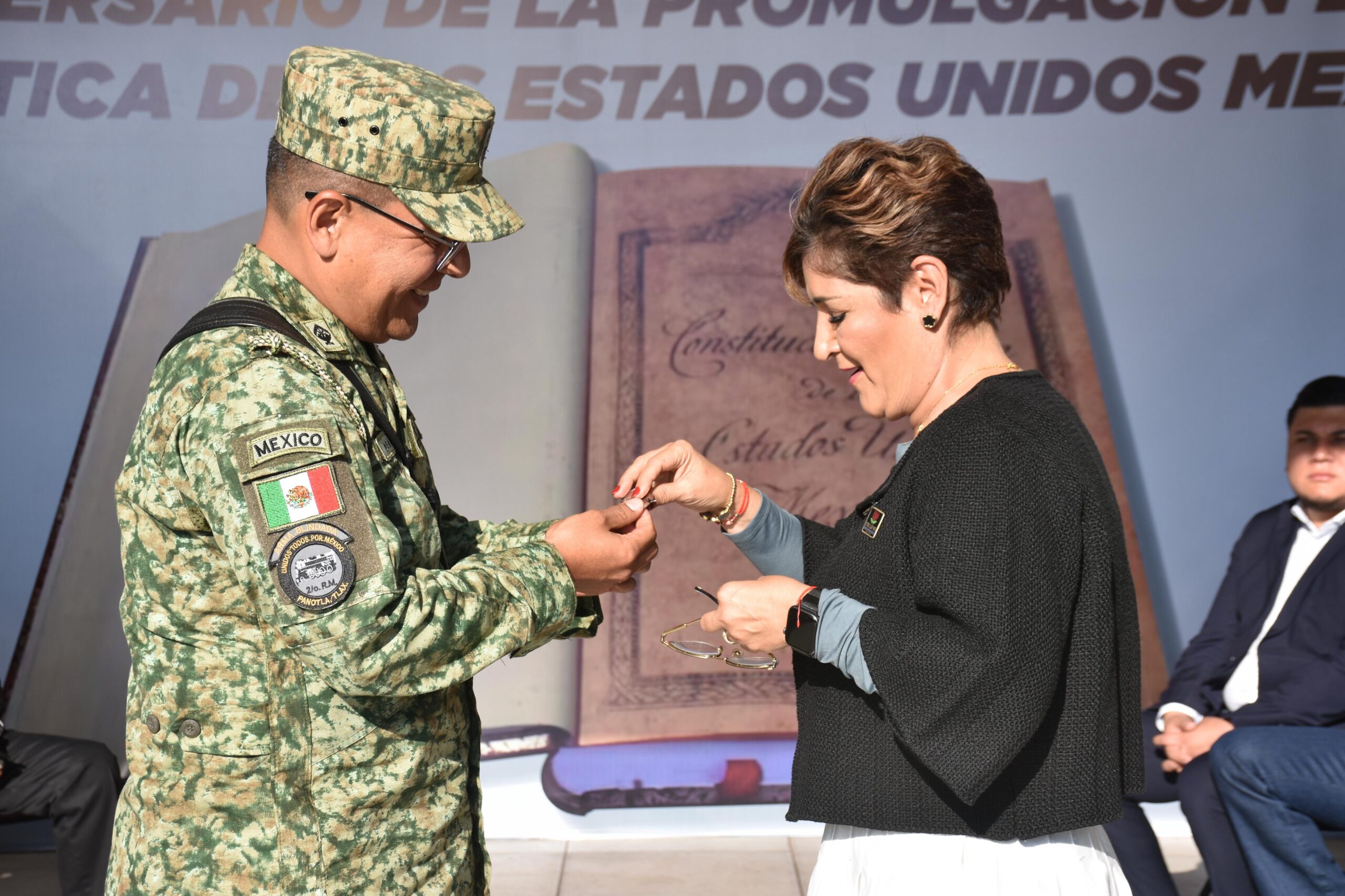 Durante este acto cívico el Coronel del Arma Blindada de Estado Mayor Carlos Iván Peña Guerra, Comandante del 2/o. Regimiento Mecanizado, hizo entrega a la C. Hilda Maldonado Medina, Síndica Municipal, un pin conmemorativo a los eventos de “Febrero, mes del Ejército y Fuerza Aérea Mexicanos”, quien agradeció tan amable gesto del personal de la Secretaria de la Defensa Nacional.