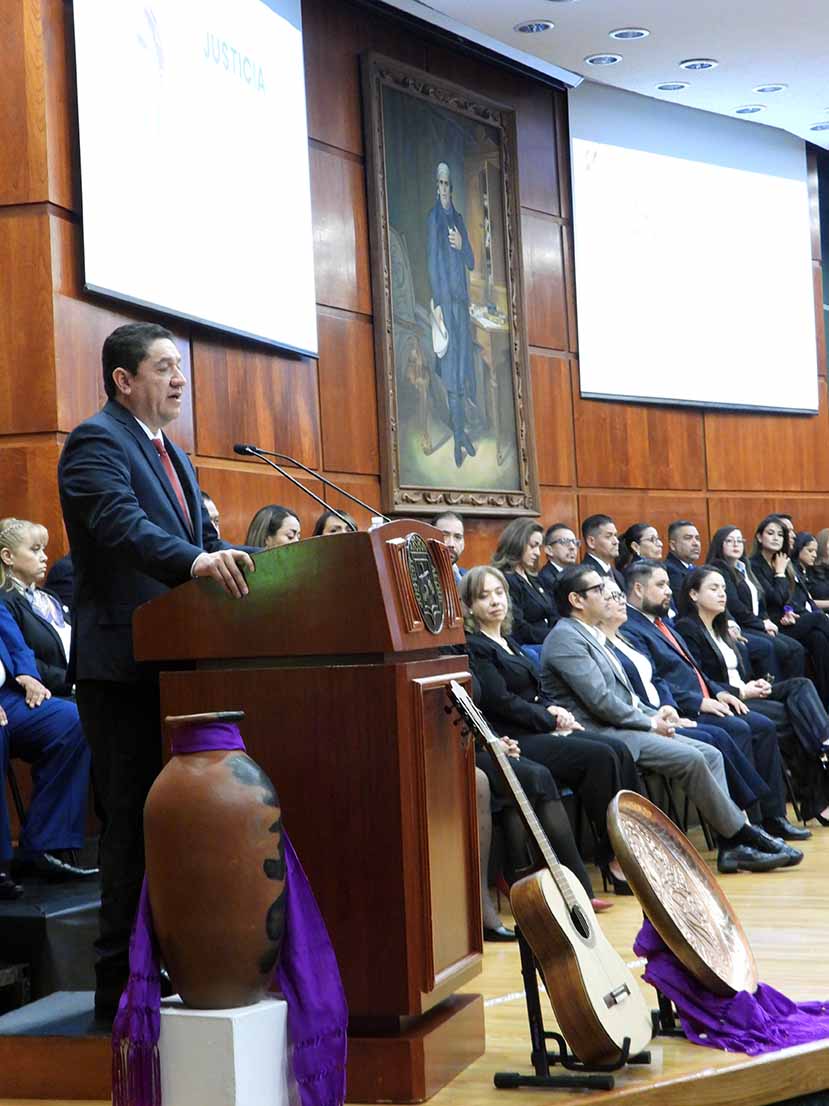 Ante el gobernador Alfredo Ramírez Bedolla y Baltazar Gaona García, presidente de la Mesa Directiva del Congreso del estado, Gama Coria expresó que el Nuevo Poder Judicial está encaminado a una justicia más profesional, cercana, ágil y transparente.